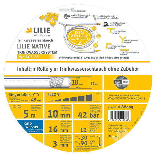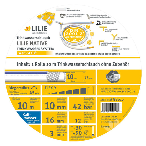 Trinkwasserschlauch-Set WeißGelb kalt 10x16 mm, Verkaufspackung 10 m Rolle + Zubehör