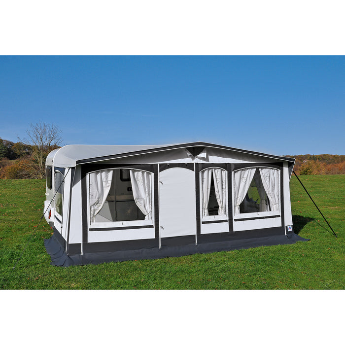 Das fünfteilige Dauervorzelt ist mit einem Spezialkeder zur Aufnahme der schraublosen Halteböckchen (nicht im Lieferumfang) ausgestattet. Unter allen Fenstern befinden sich Sturmleisten und Hohlsäume. Mit doppeltem Erdstreifen, Sturmgurtclip und Vario-Ecke, die sich an den Wohnwagen anpasst.