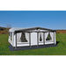 Vorderwand: 2-tlg., gegeneinander austauschbar. Zur Veranda abklappbar. Eingang hoch- und wegrollbar. Mit Klett und Flausch für Senkrechtstange. Verschließbare Dauerhochentlüftung.