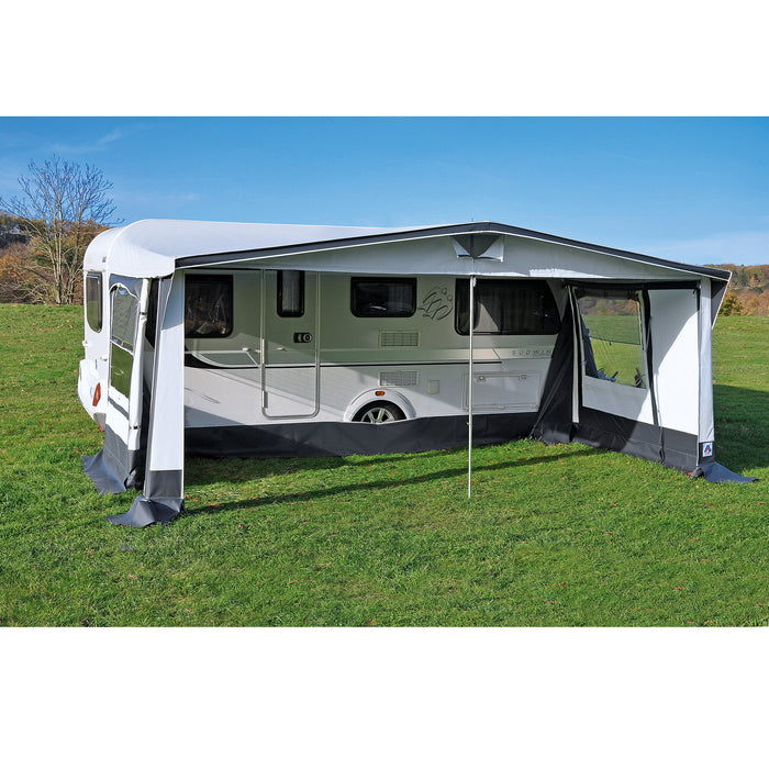 Das fünfteilige Dauervorzelt ist mit einem Spezialkeder zur Aufnahme der schraublosen Halteböckchen (nicht im Lieferumfang) ausgestattet. Unter allen Fenstern befinden sich Sturmleisten und Hohlsäume. Mit doppeltem Erdstreifen, Sturmgurtclip und Vario-Ecke, die sich an den Wohnwagen anpasst.