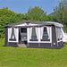 Ideales Vorzelt für alle Dauercamper. Unter allen Fenstern befinden sich außen Sturmleisten sowie Hohlsäume auf der Innenseite. Das Zelt hat drei Dachkanäle, einen Spezialkeder zur Aufnahme von schraublosen Halteböckchen (nicht im Lieferumfang) und einen seitlichen Keder für eine Regenrinne. Die vorhandene Vario-Ecke passt sich an den Wohnwagen an. Der doppelte Erdstreifen mit angenähtem Keder zwischen den Faulstreifen ermöglicht es, spezielle Abspannhaken nach Wunsch zu verschieben.