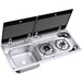 Einbau-Kocher-Spülenkombination mit separaten Abdeckungen aus temperaturbeständigem Sicherheitsglas und Bohrung für Wasserhahn