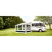 Das bewährte Schutzzelt Safari Residence setzt sich aus 2 einzelnen Seitenwänden und einer Vorderwand in neutraler Farbe (RAL 9002) zusammen. Die in den Seitenteilen eingearbeiteten Fensterfolien sind mit Moskitonetzen versehen und können vollständig geöffnet werden. Das Vorderteil hat sowohl rechts als auch links eine eingearbeitete Eingangstüre (ab Länge 3,5 m) und kann sowohl teilweise als auch vollständig aufgerollt werden. Durch die integrierte Befestigungsschiene kann die Front bequem z. B. mit einem Sun-Blocker kombiniert werden. Mittels eines Klemmprofils werden die Seitenwände fest mit dem Markisentuch verbunden. Front und Seiten werden durch ein Doppelkeder-Profil miteinander verbunden, so dass eine starke, windfeste Verbindung entsteht. Ein in der Höhe verstellbares mit einer doppelten Gummilippe versehenes Mastprofil, in das der Keder der Seitenwand eingeschoben wird, wird gegen die Fahrzeugwand gedrückt und dichtet diesen Bereich dadurch perfekt ab. Für zusätzliche Stabilität sorgt eine diagonale Stütze zwischen dem Klemm- und dem Mastprofil. Das Thule Residence G3 ist in 6 verschiedenen Höhen (siehe Tabelle) für Fahrzeuge mit geraden Seitenwänden lieferbar. Für den Fall einer dicht über der Fahrzeugtür montierten Markise der Typen 5003, 5200 und 8000 sind spezielle Seitenwände in den Höhen M und L zur Kombination mit einer höheren Vorderfront mit geringerem Dachgefälle als Sonderbestellung erhältlich. Bei allen Sonderbestellungen muss mit einer Lieferzeit von ca. 4 – 6 Wochen gerechnet werden. Lieferung erfolgt inklusive 2 Packtaschen und Wagenschürze.