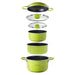 Alu-Topfset mit Edelstahldeckel und Soft-Touch Griffen. Mit Antihaftbeschichtung. Geeignet für Gas-, Elektro-, Halogen- und Keramikkochfeld.